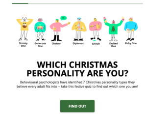 The quiz tapped into the Christmas buzz in a clever, familiar and creative way, leading to a great brand awareness and exposure exercise for Green Chef. The asset also powered a news story, distributed to national media.  Personality types included in the quiz ranged from the ‘Grinch’ to ‘the generous one’ and were fun, tongue-in-cheek and relatable.
